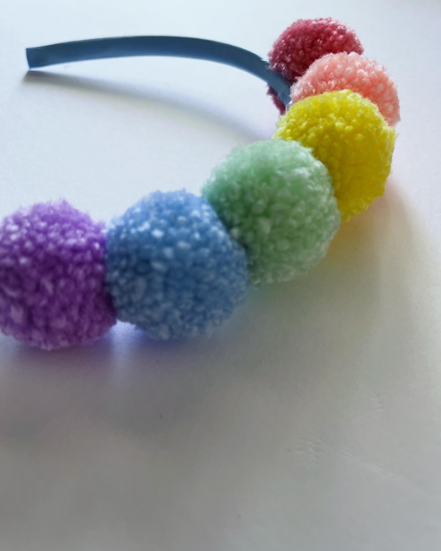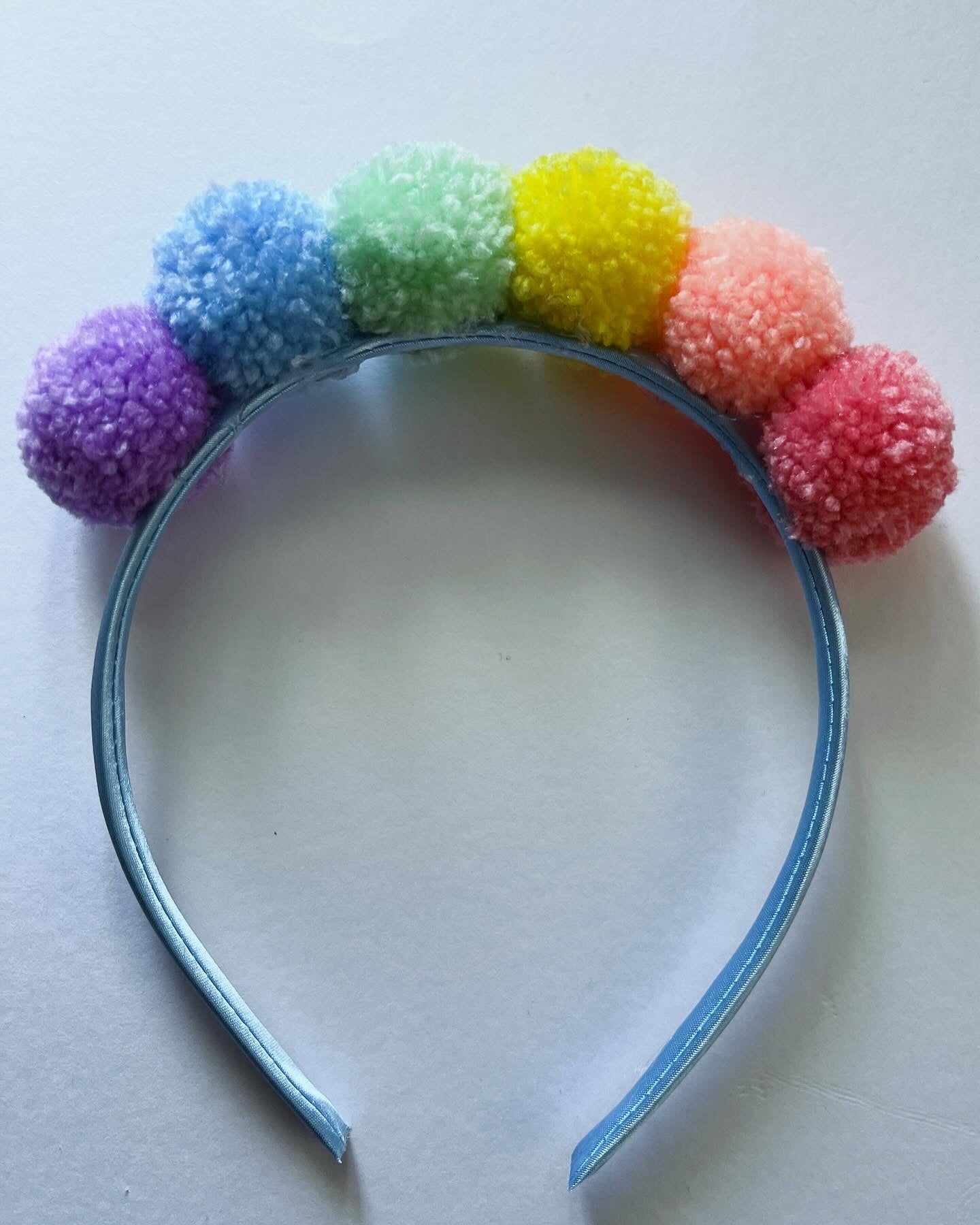 Χειροποίητη στέκα μαλλιών, διακοσμημένη με πομ πομ στα χρώματα του ουρανίου τόξου.