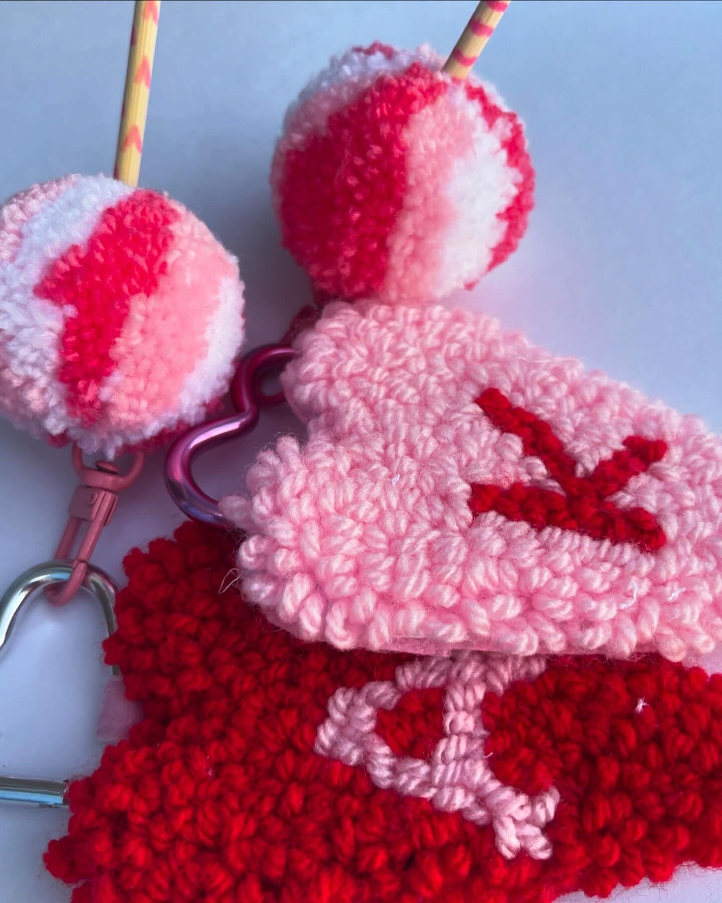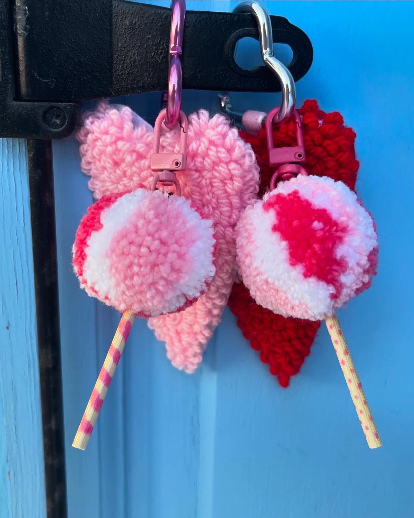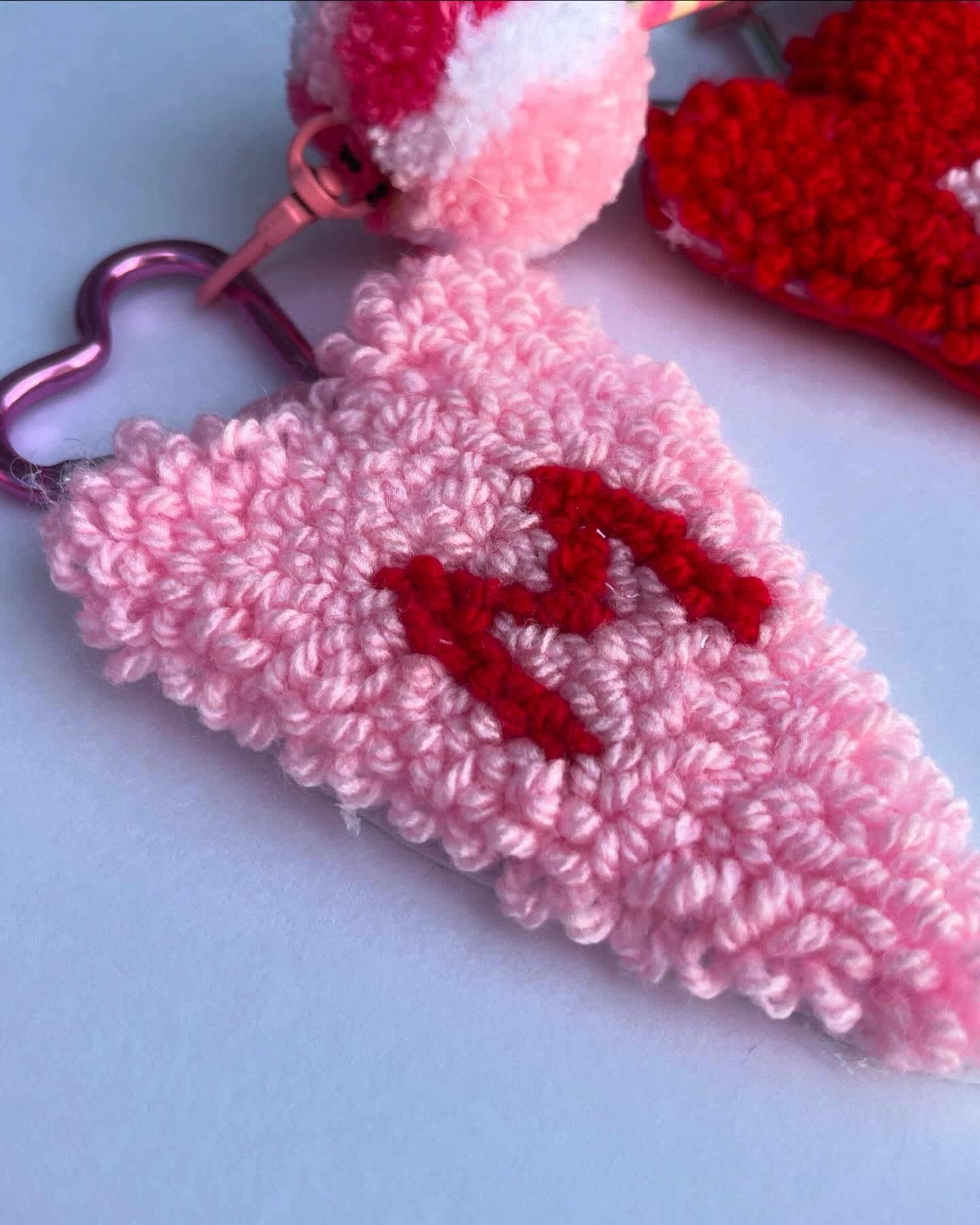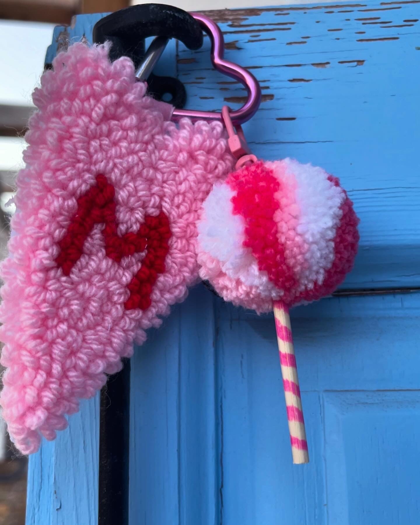 Διακοσμητικό στοιχείο για τσάντες ή για κλειδιά, αποτελείται από μια καρδιά με ή χωρίς το αρχικό σας γράμμα (προσωποποιημένο) και ένα πομ πομ γλειφιτζούρι.