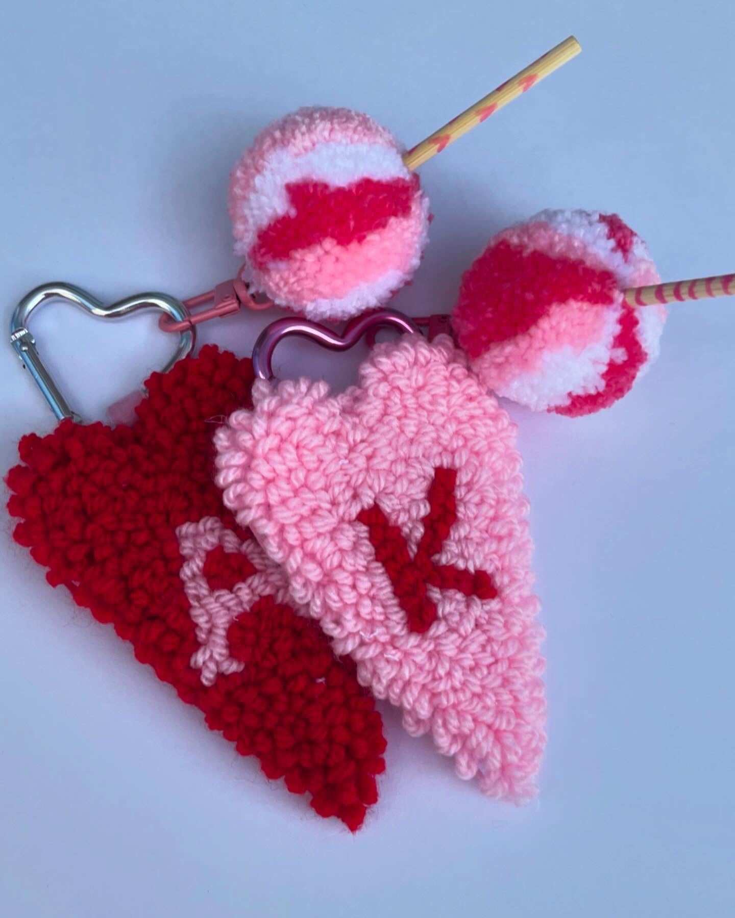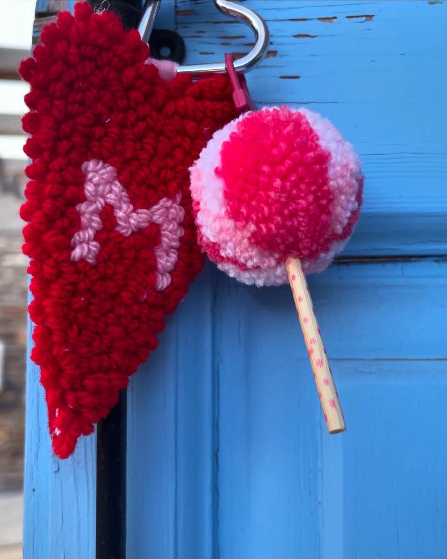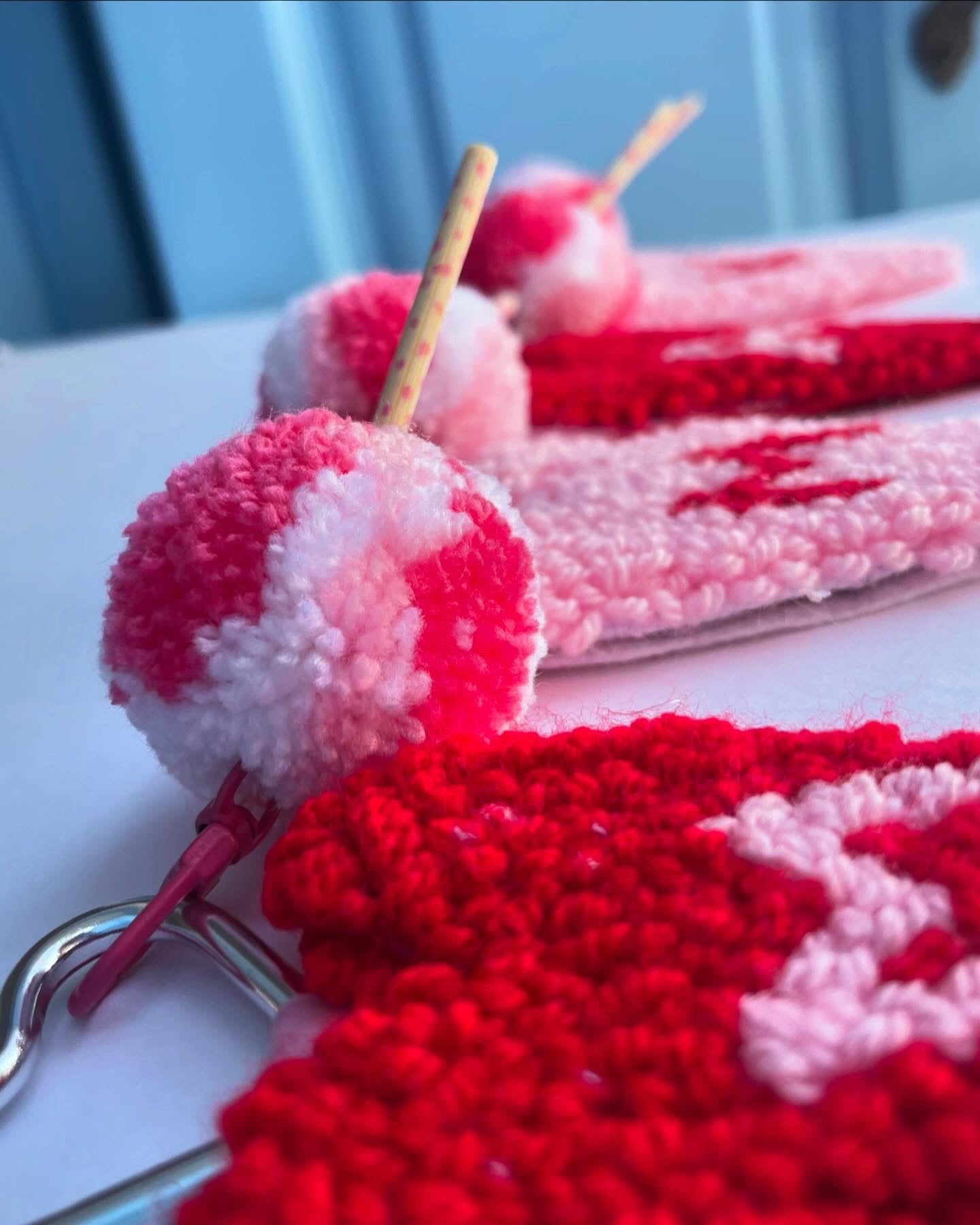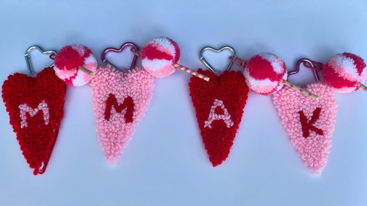 Διακοσμητικό στοιχείο για τσάντες ή για κλειδιά, αποτελείται από μια καρδιά με ή χωρίς το αρχικό σας γράμμα (προσωποποιημένο) και ένα πομ πομ γλειφιτζούρι.