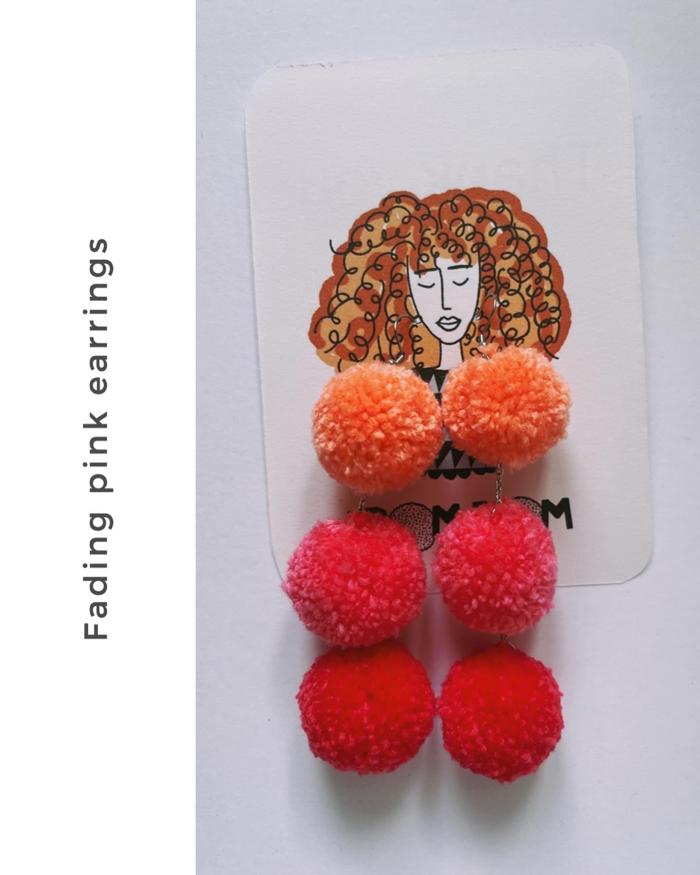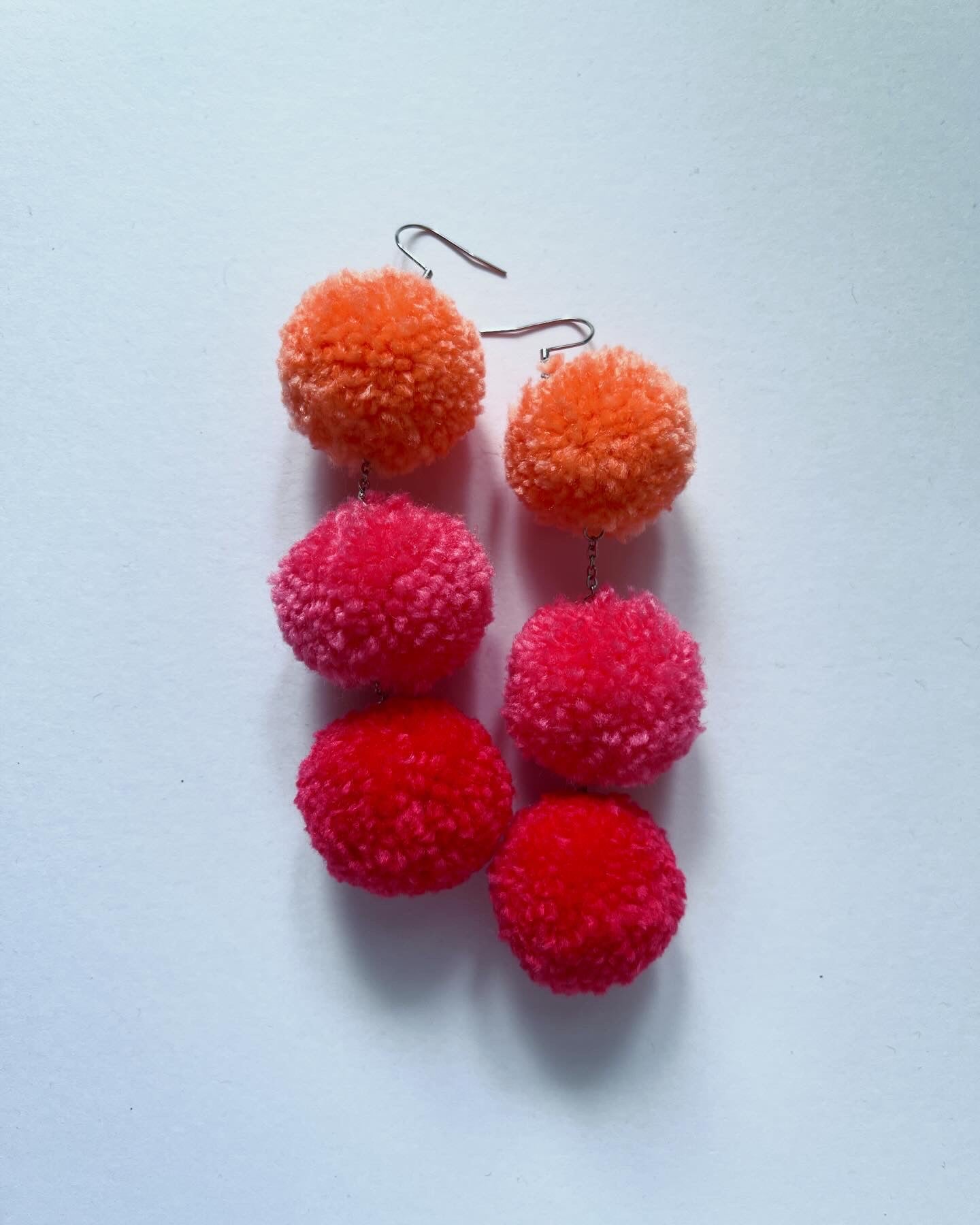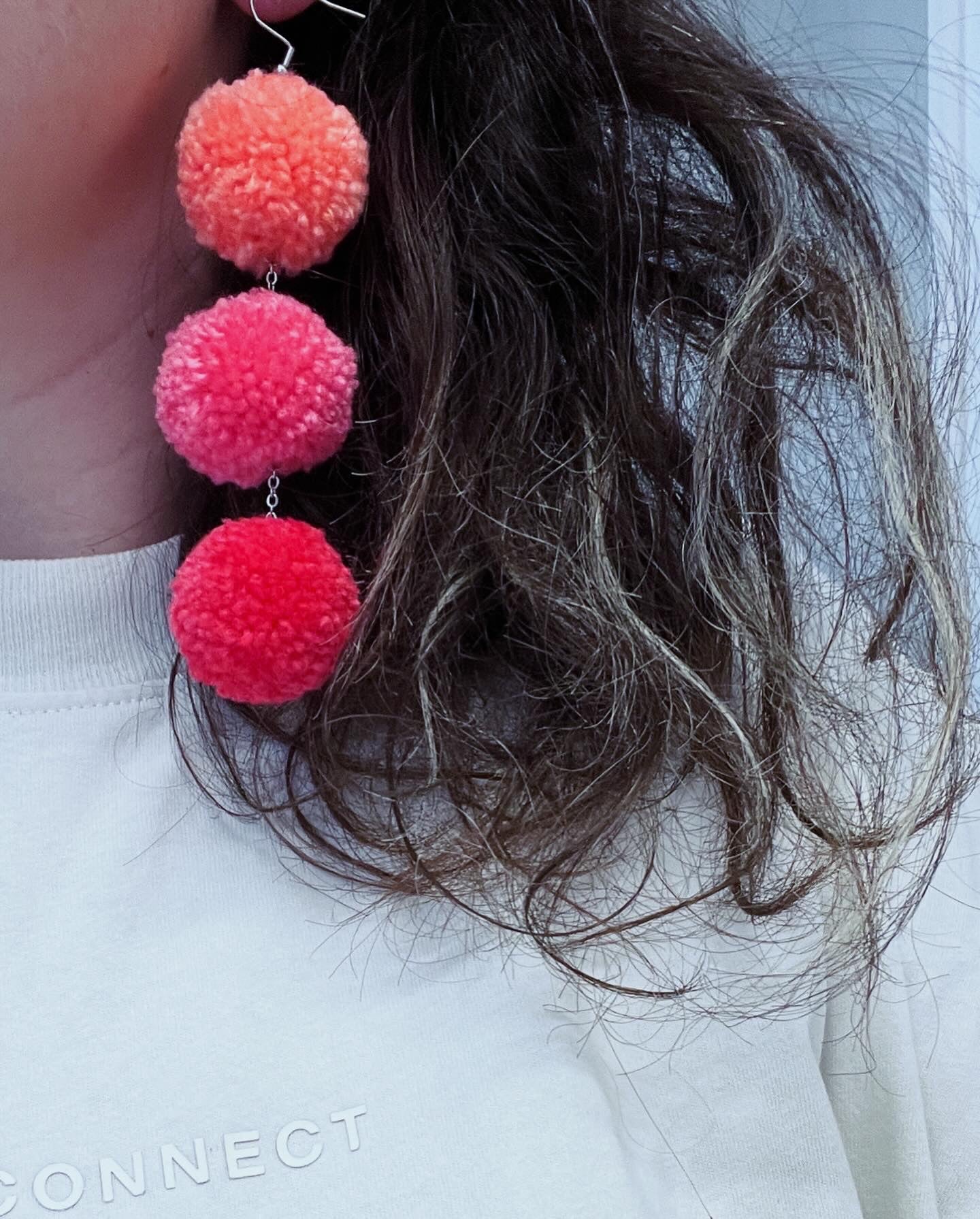 Κρεμαστά σκουλαρίκια με 3 πομ πομ ενωμένα με αλυσίδα.