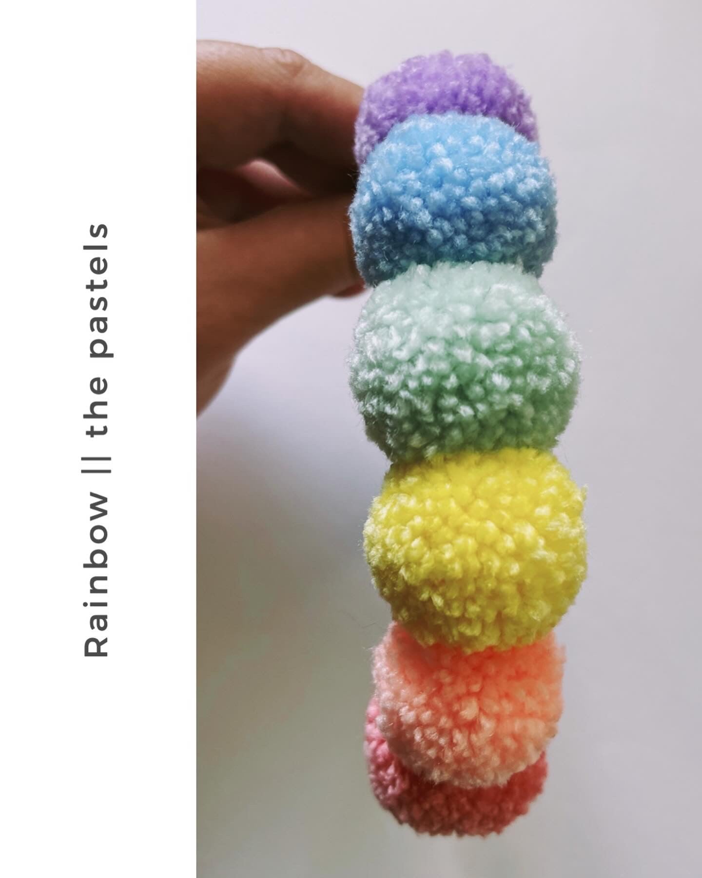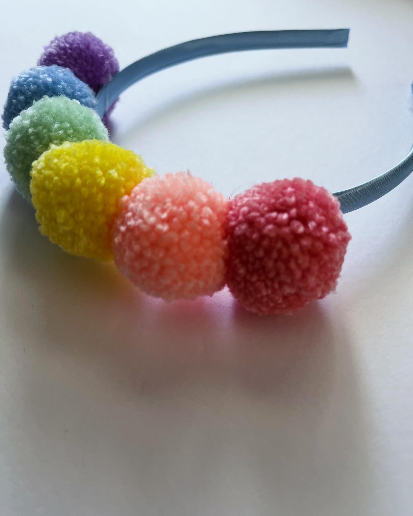 Χειροποίητη στέκα μαλλιών, διακοσμημένη με πομ πομ στα χρώματα του ουρανίου τόξου.